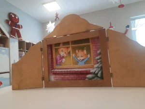 Dzisiaj podczas zajęć dzieci uczestniczyły w teatrzyku kamishibai pt. „Zimowe zabawy”. Barwne ilustracje i ciekawa opowieść wprowadziły wszystkich w zimowy nastrój. Teatrzyk rozbudził wyobraźnię dzieci, rozwijał umiejętność słuchania i sprawił im wiele radości.